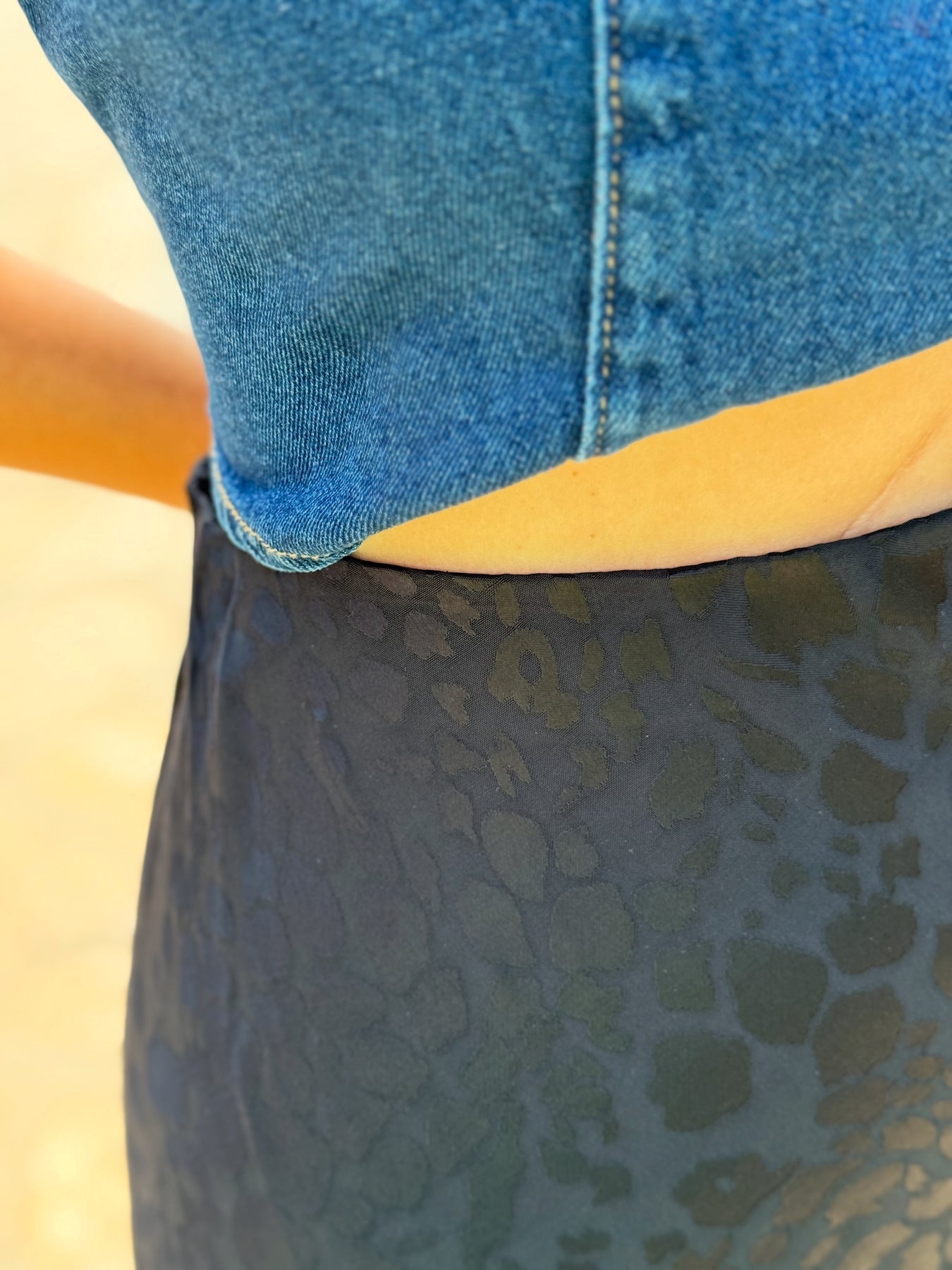 Siyah Saten ,Belli Lastik Ve Fermuar Detaylı ,Leopar Desenli.