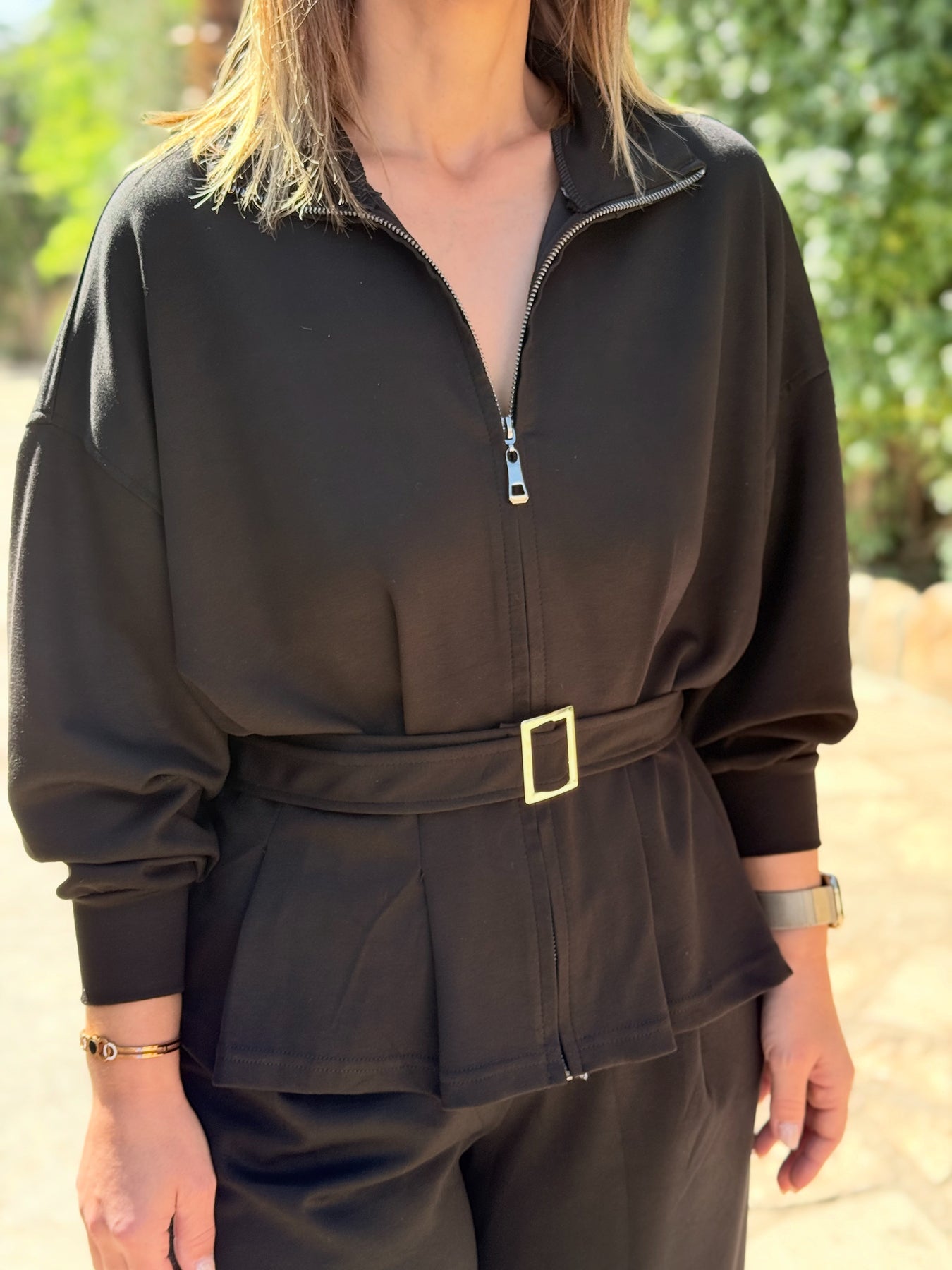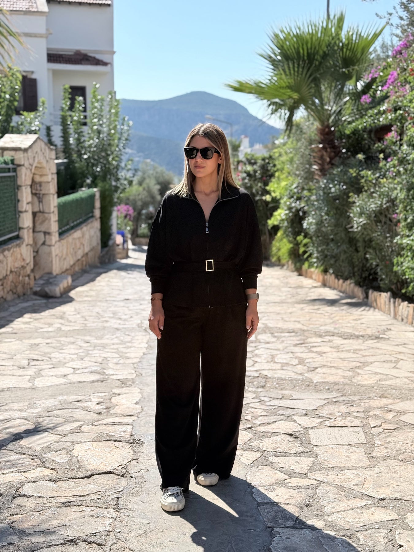 Kemer Detaylı, Modal Kumaş Siyah Pantolonlu Takım
