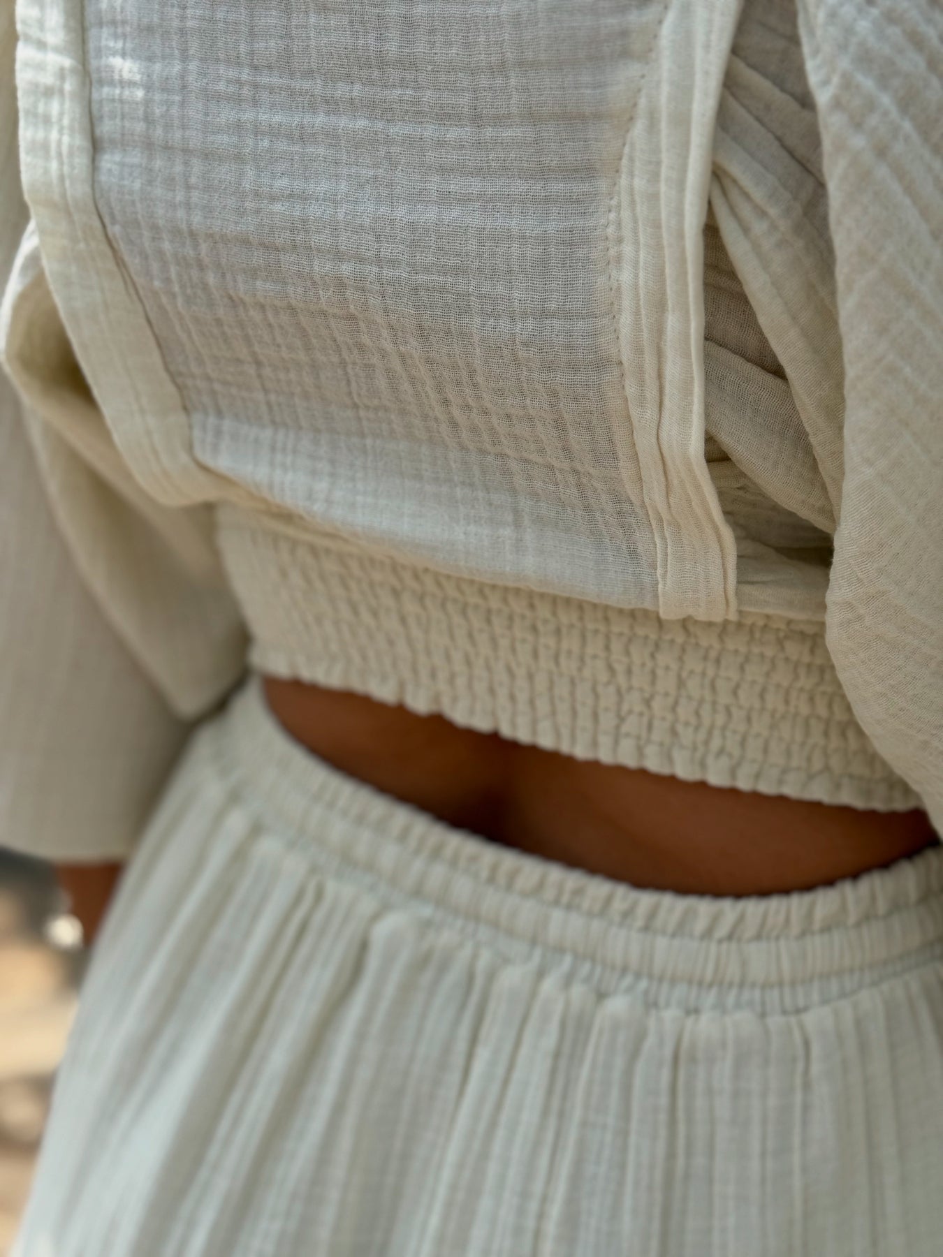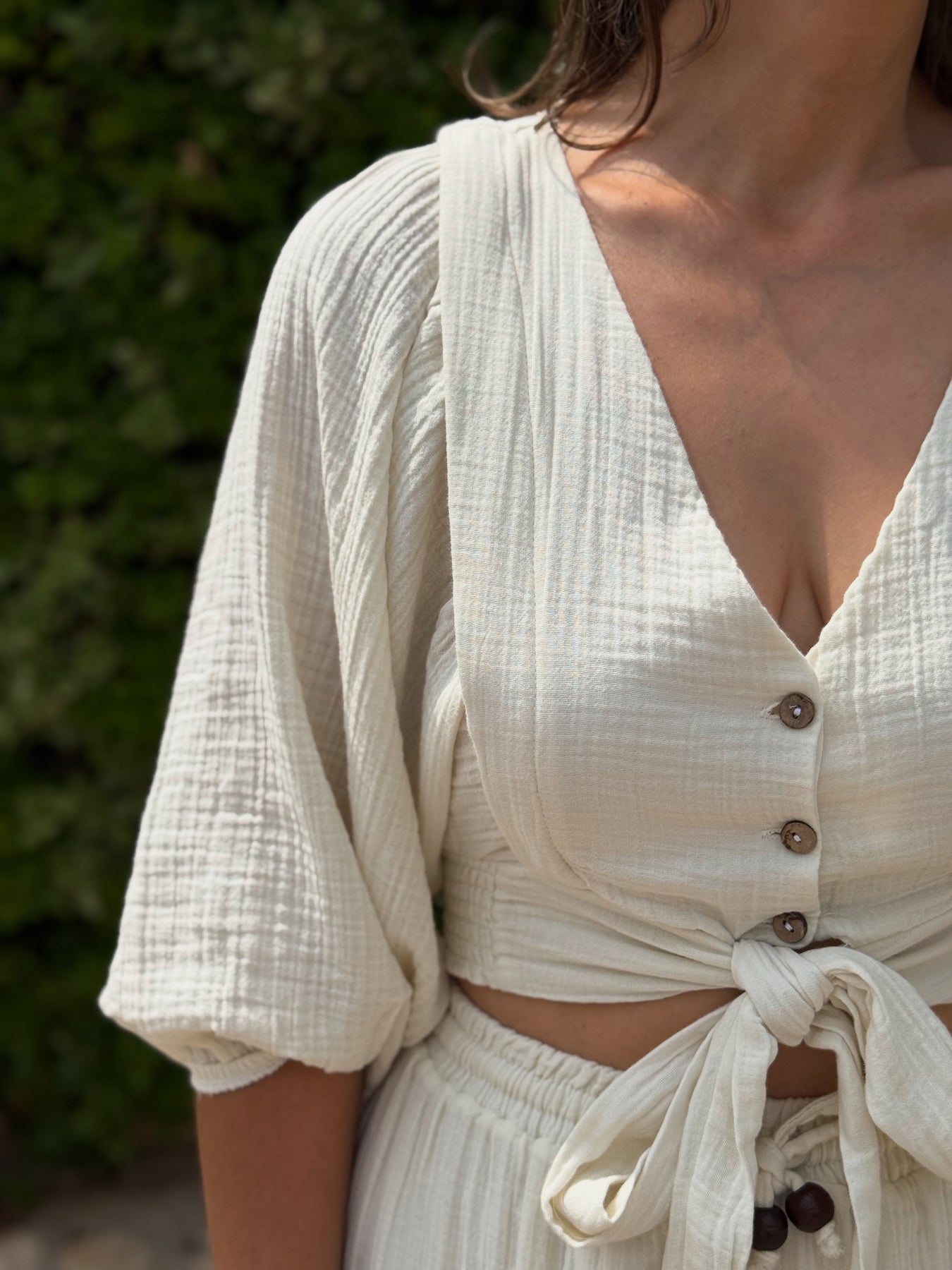 Müslin Kumaş, Beli Lastik ve Bağlama Detaylı, Crop Düğme ve Bağlama Detaylı.