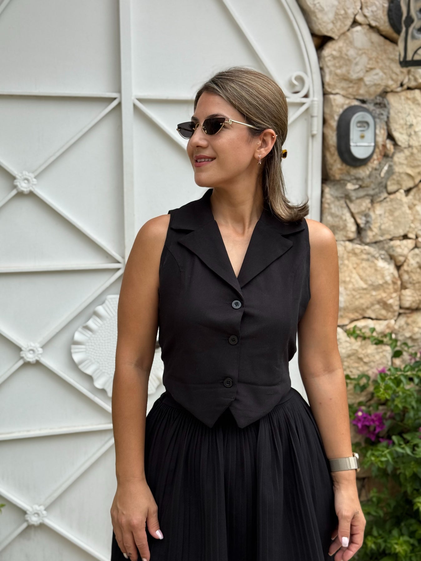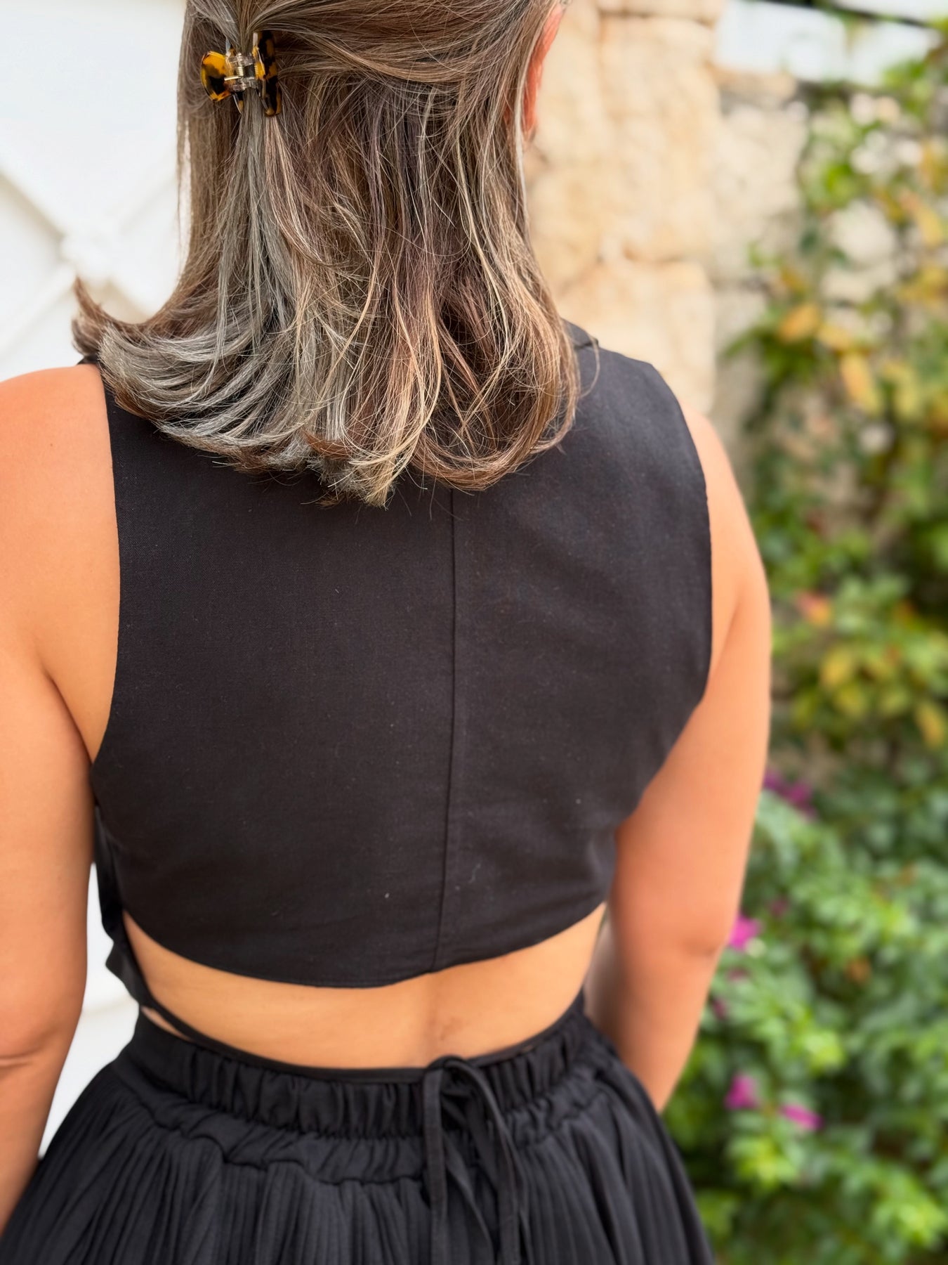 Siyah Keten Kumaş, Sırt Bağlama Detaylı, Düğme Detaylı.