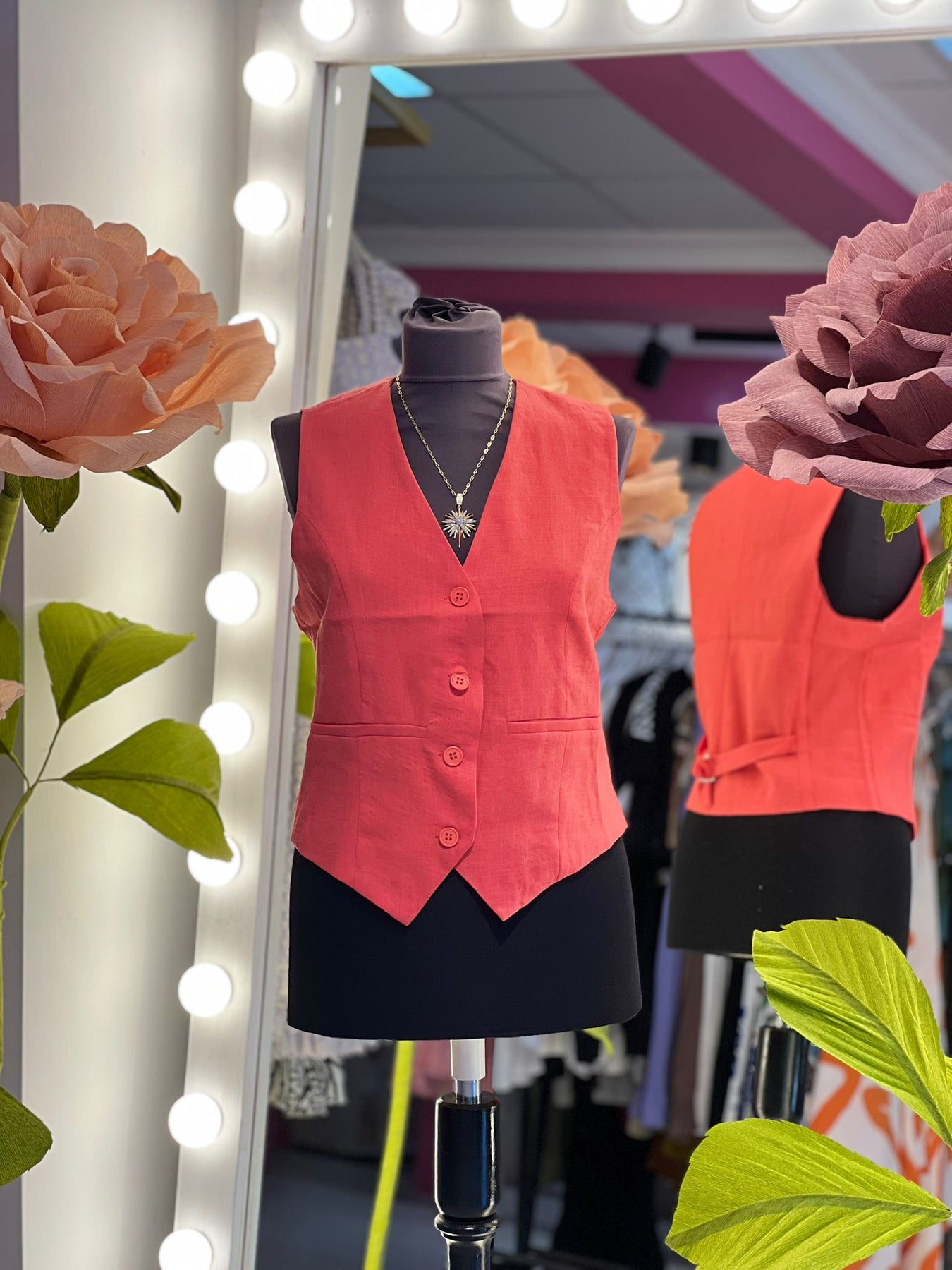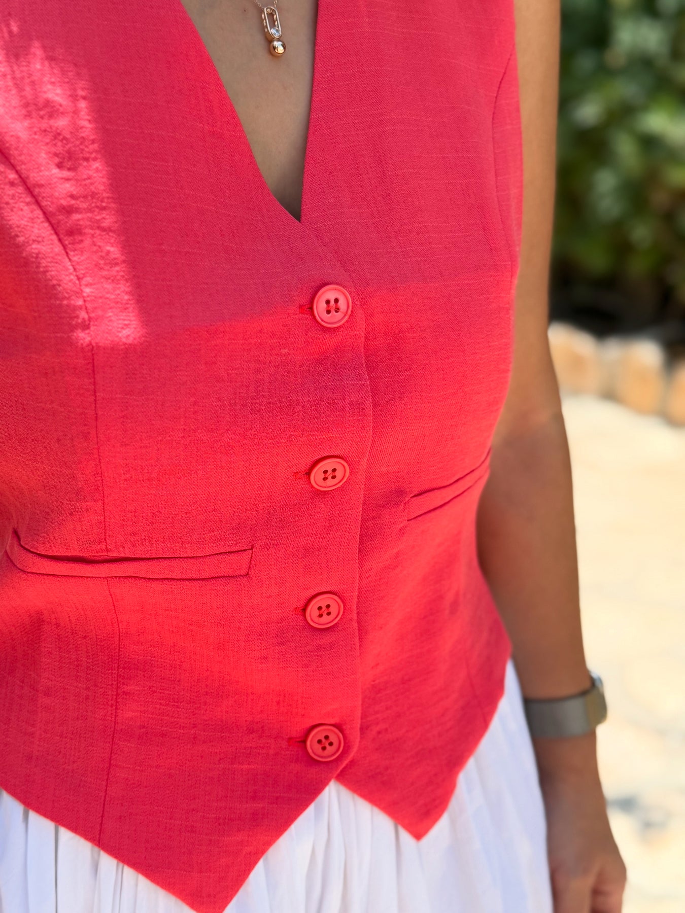 Keten Düğmeli  Narçiçeği Arka Kemer Detaylı Yelek