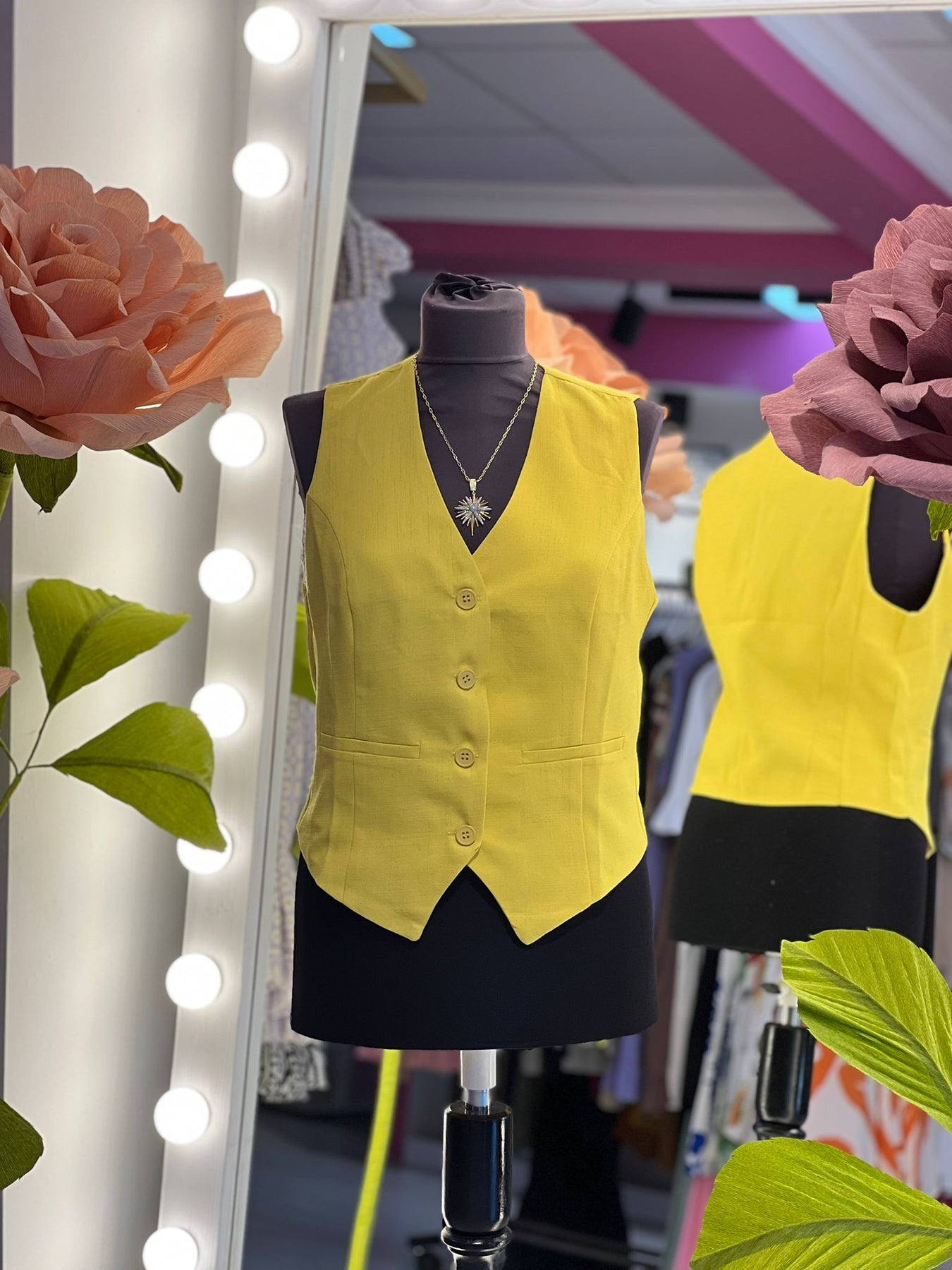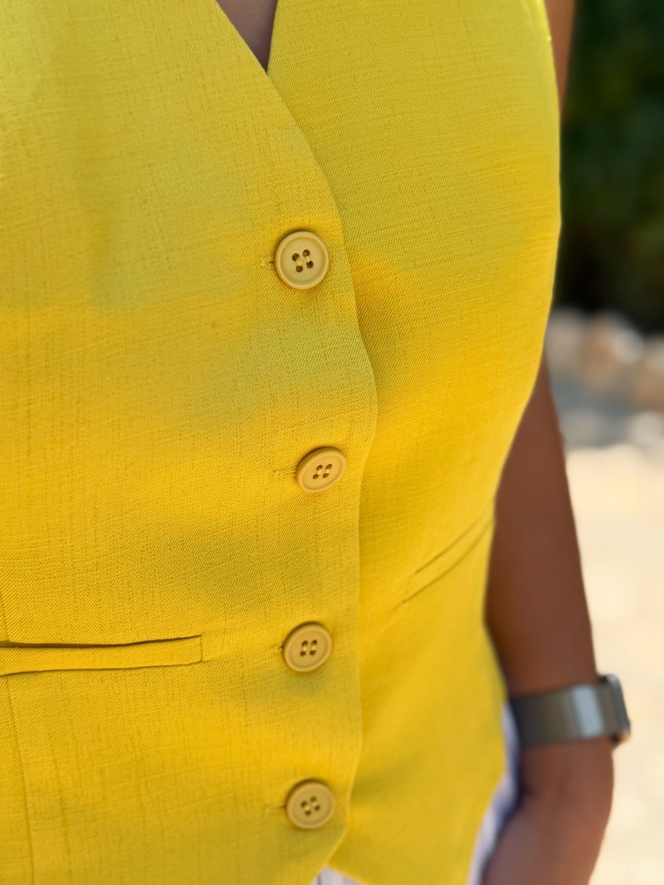 Keten Kumaş Sarı Renk Düğmeli Arka Kemer Detaylı Yelek