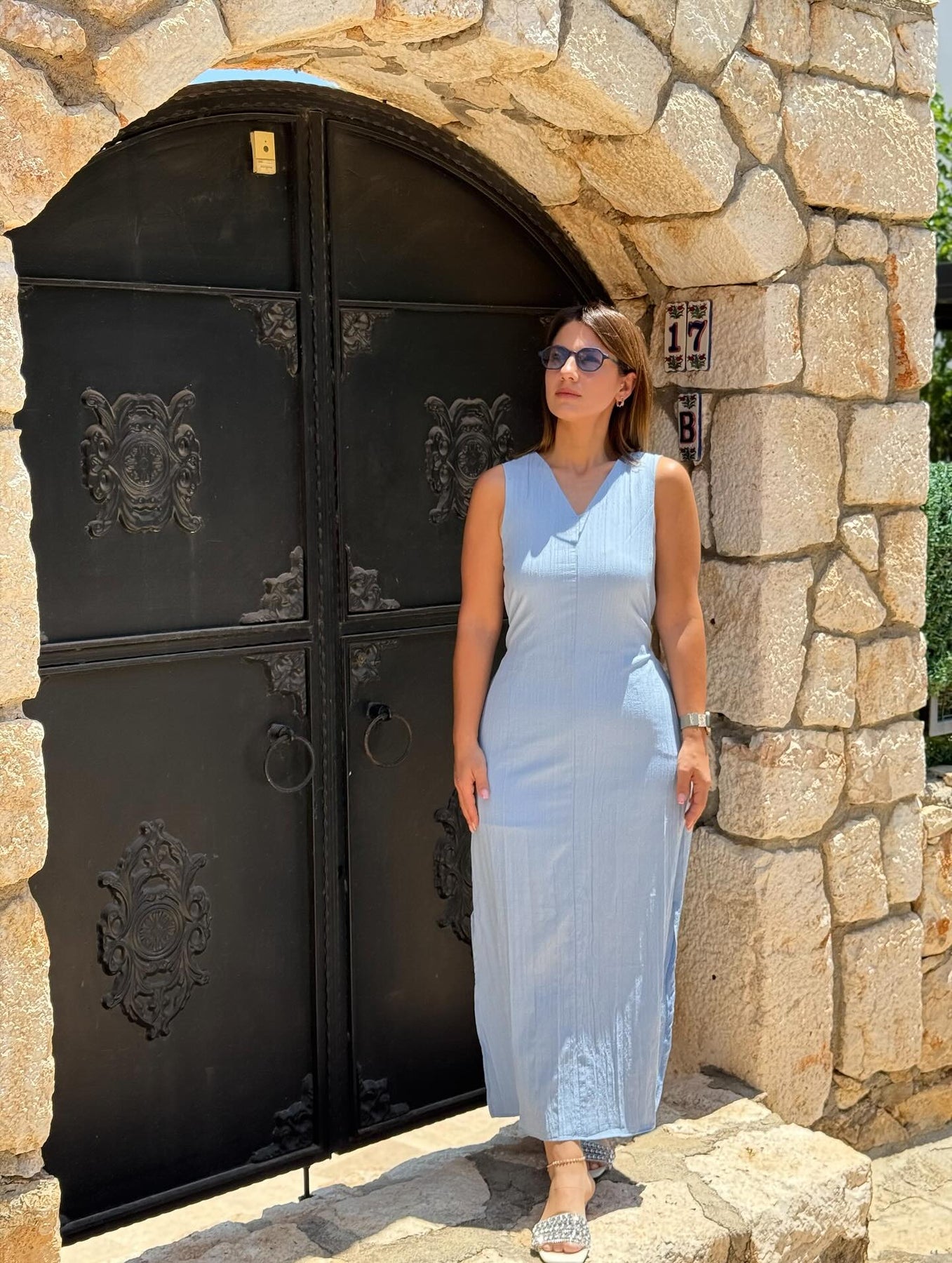 Maya Kumaş, V Yaka, Kuşaklı, Cepli, İç Astarlı, Yan Yırtmaçlı, Mavi Elbise, Bedenli Üründür.